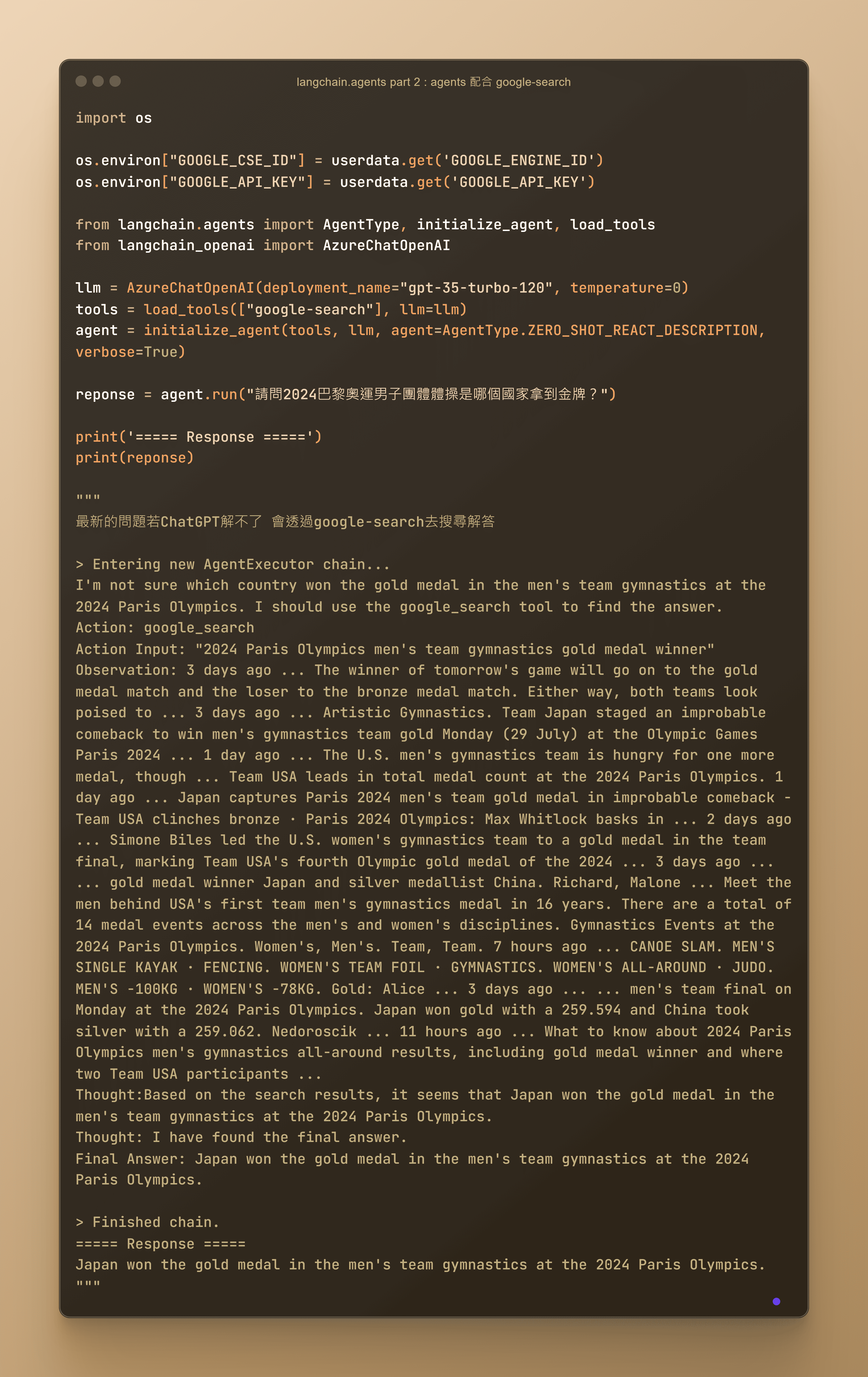 搜索引擎: Agent 可以利用搜索引擎來查找最新的資訊,回答用戶的問題。這對於需要實時資訊的應用非常有用。
