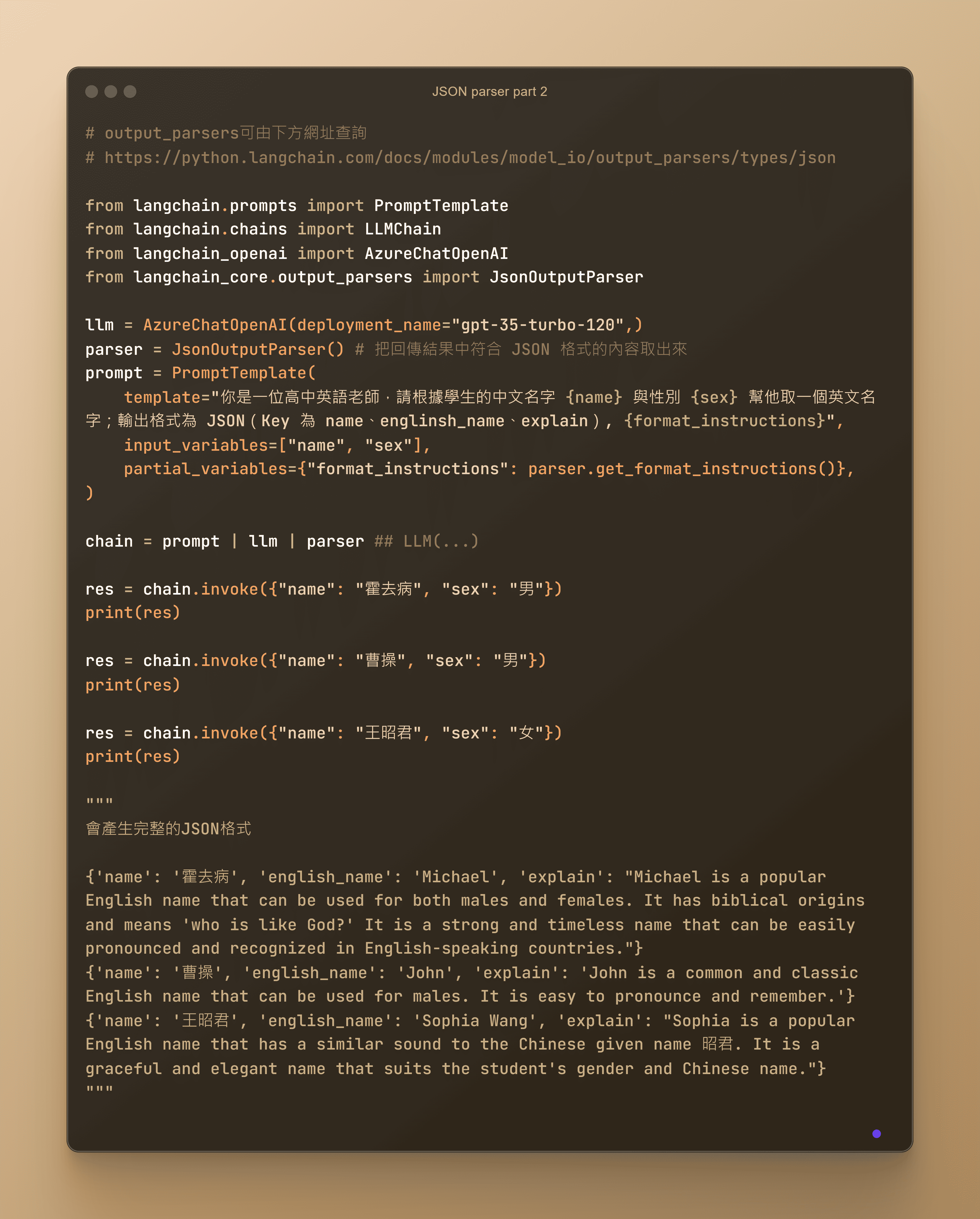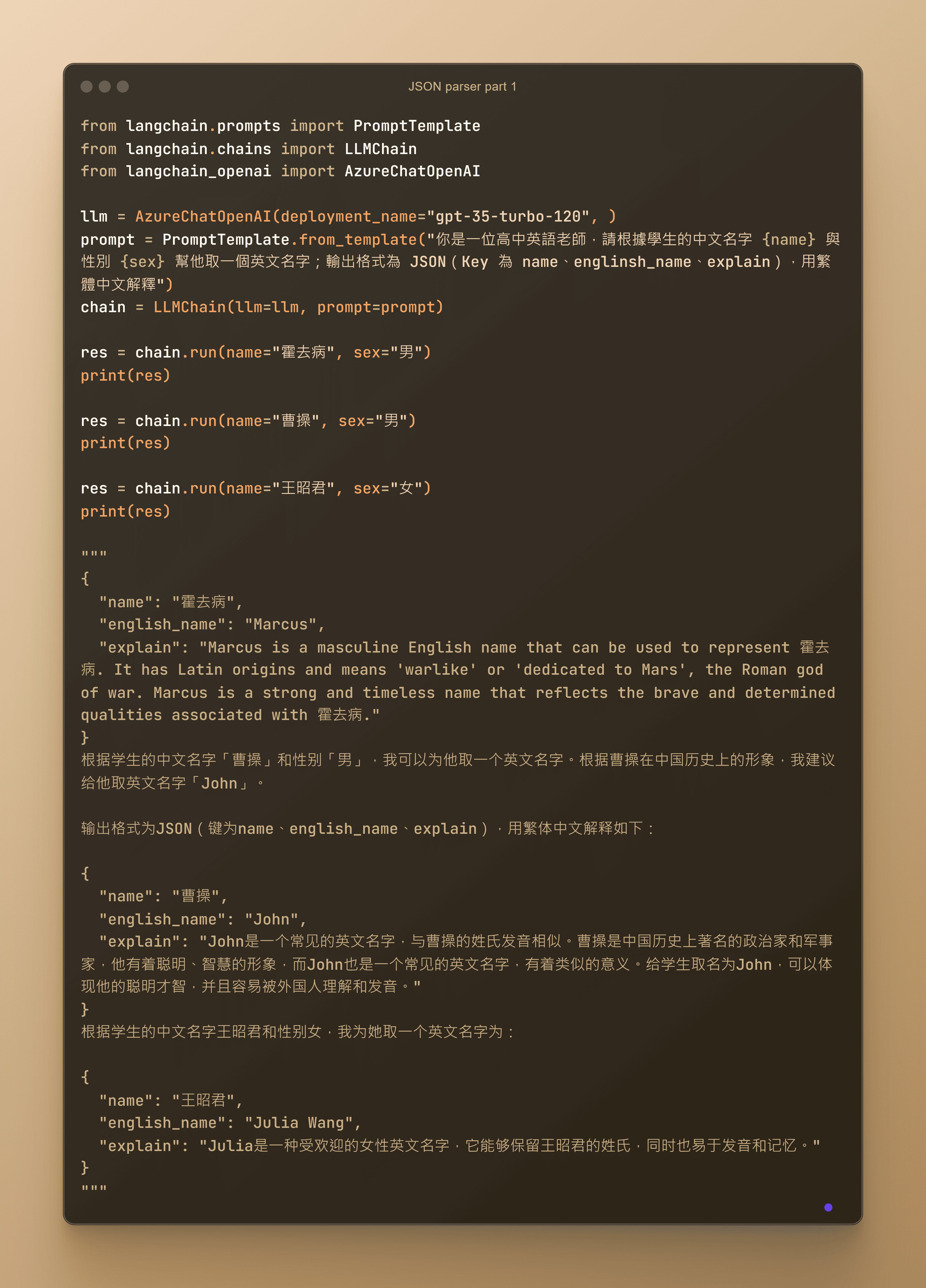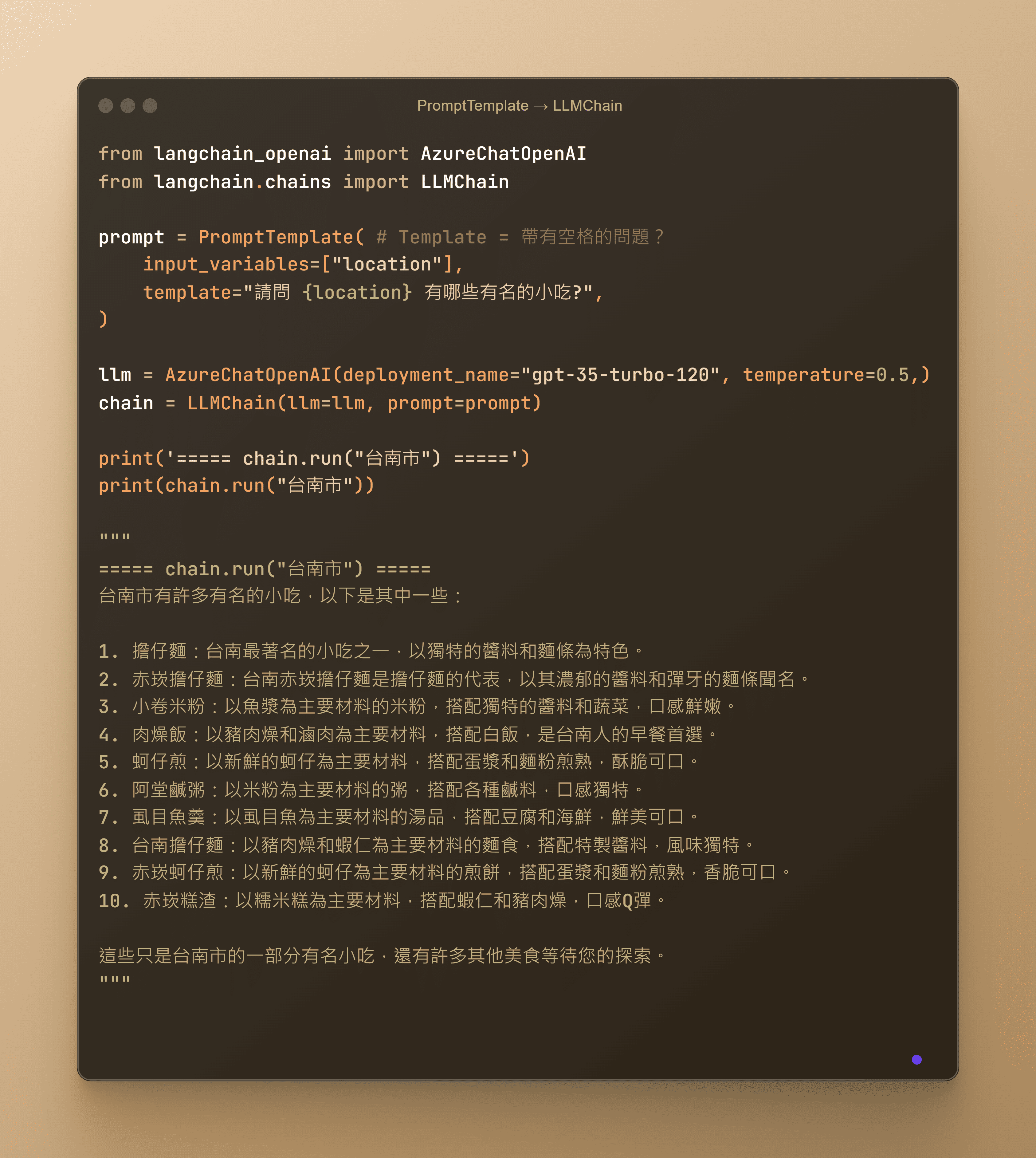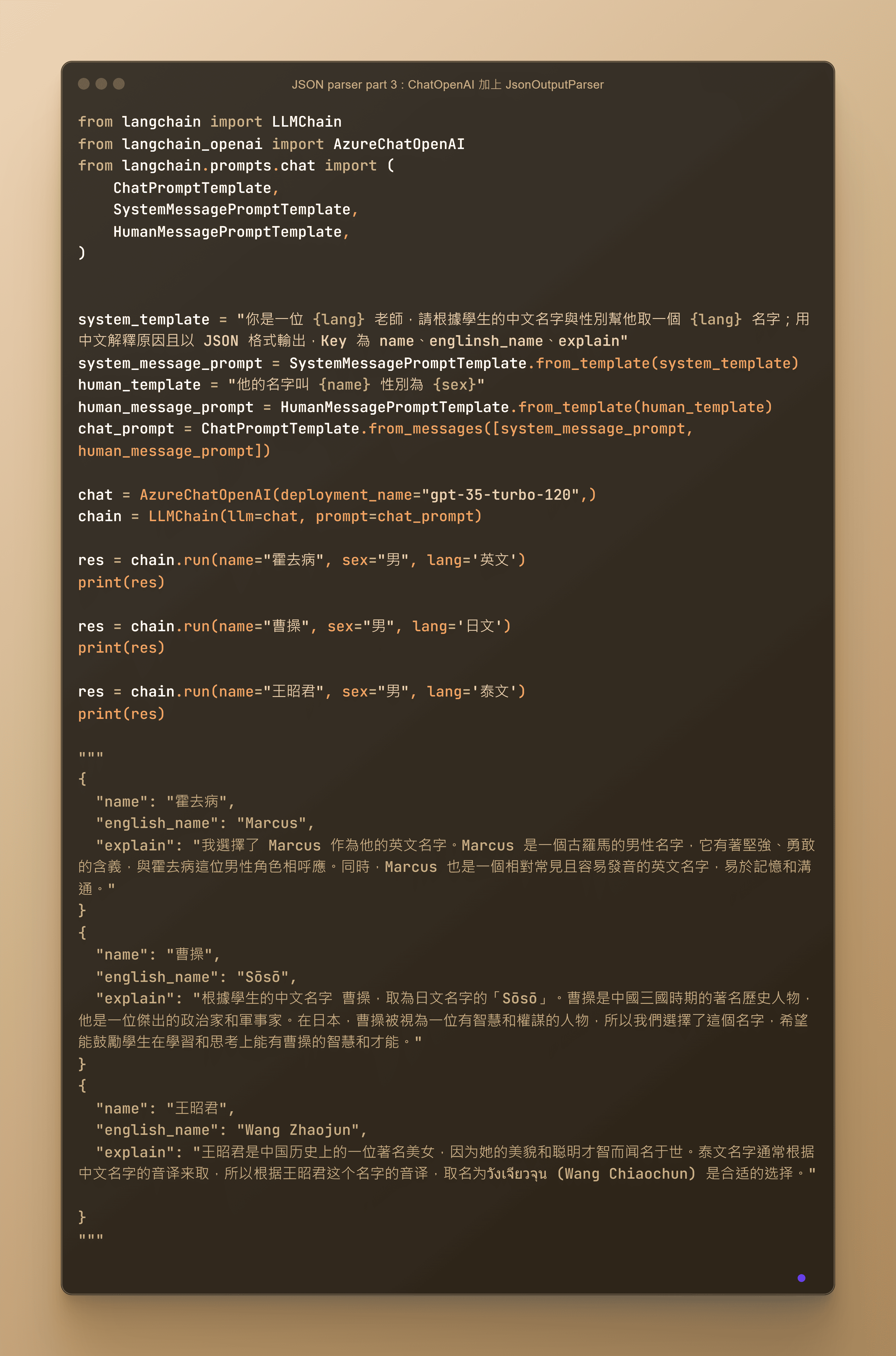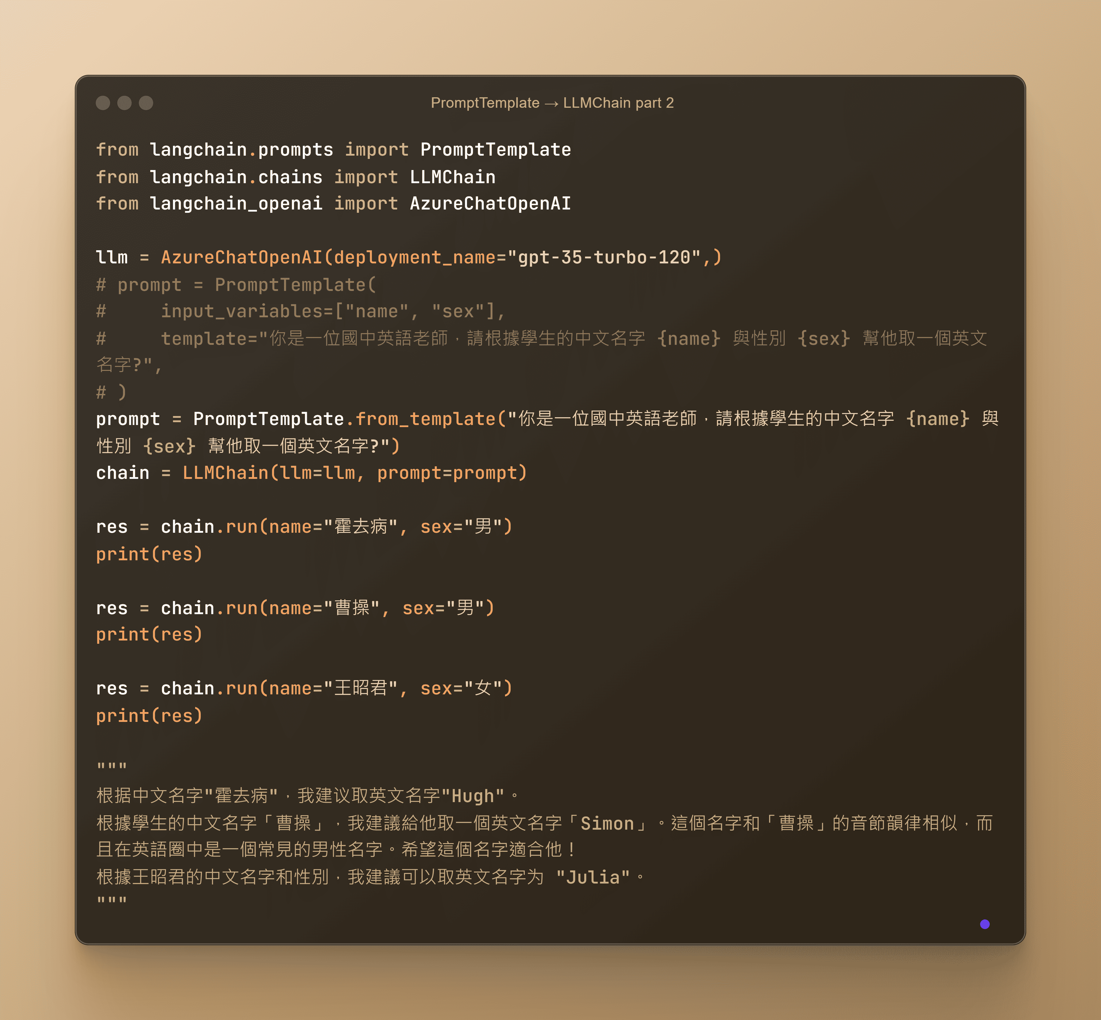 最近在上LLM線上課 來分享我所學到的 LangChain LangChian是把ChatGPT API 轉換為物件導向的形式來使用我所學到 LangChain 的五個方法 : Prompt Template / LLMChain / OutputParser / Agent / ConversationChain 這