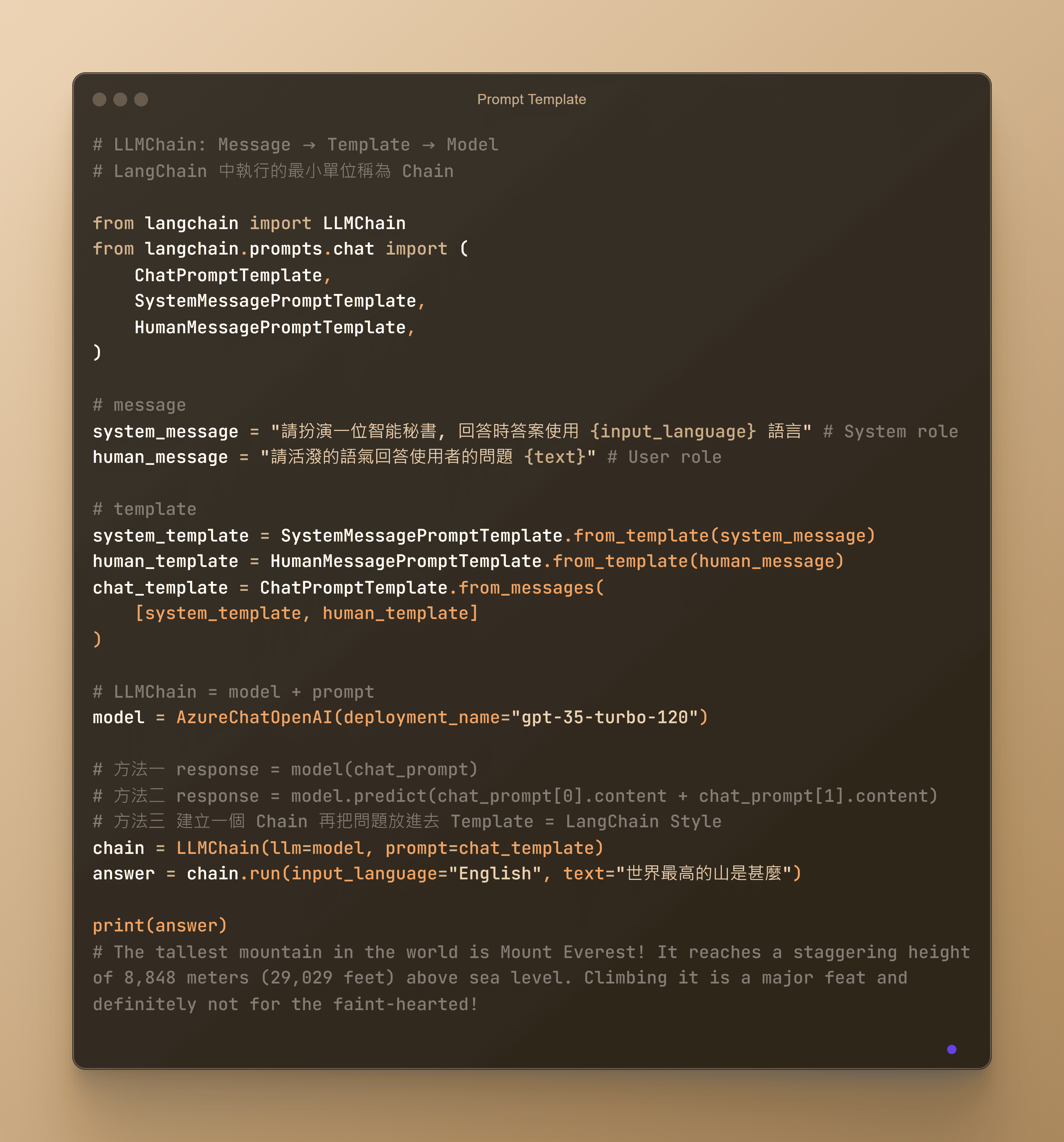 介紹: Prompt Template 是 LangChain 中的重要概念之一,用來定義和格式化我們發送給模型的訊息。這些模板能夠幫助開發者建立可重複使用的格式,確保每次與模型的互動都遵循特定的結構。